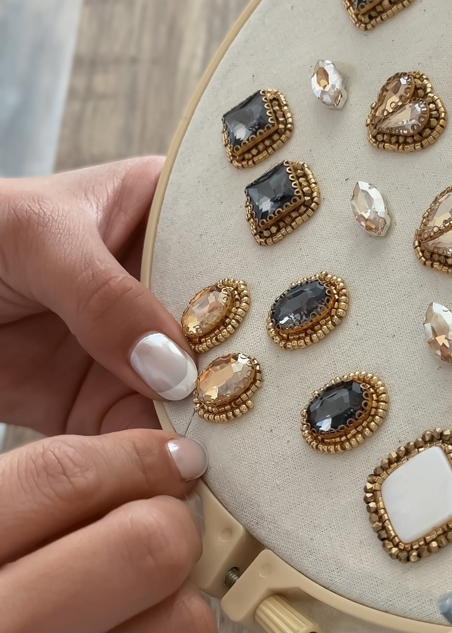 Cada material es elegido para crear una pieza única y auténtica, hecha cuidadosamente a mano con hilos y piezas de bisutería.
