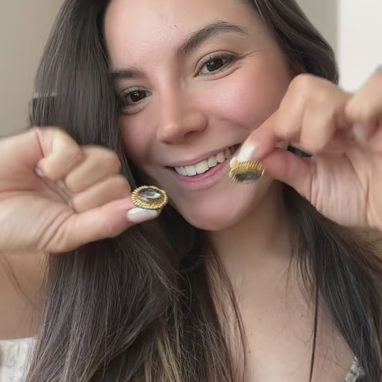 Aros bordados a mano, con pedrería y mostacillas bañadas en oro. Diseños exclusivos, creados con dedicación y atención a cada detalle, pensados para realzar tu estilo con brillo y sofisticación.